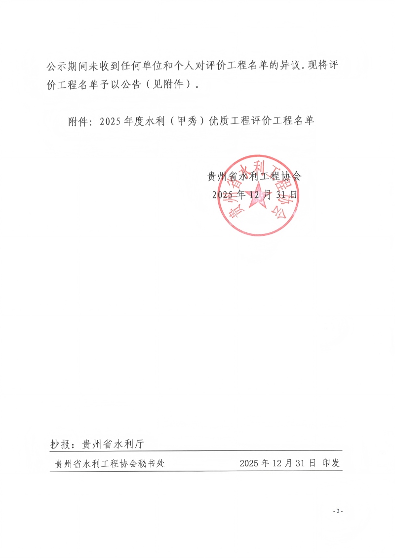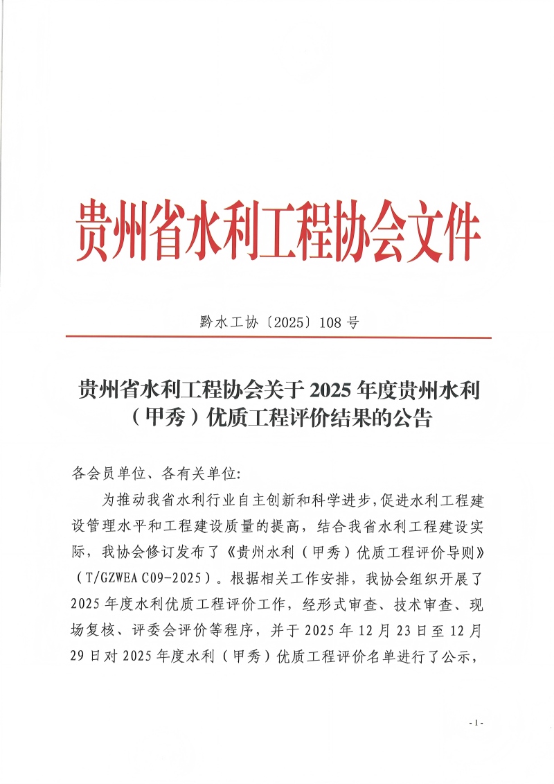 关于2025年度贵州水利(甲秀)优质工程评价结果的公告
