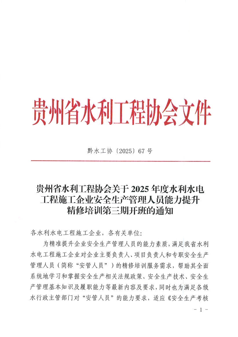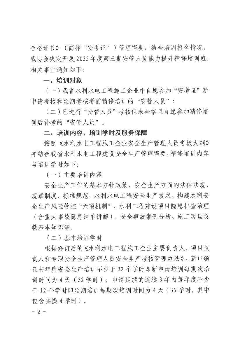 关于2025年度水利水电工程施工企业安全生产管理人员能力提升精修培训第三期开班的通知