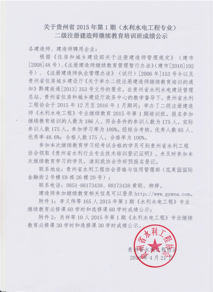 关于贵州省2015年第1期(水利水电工程专业) 二级注册建造师继续教育培训班成绩公示