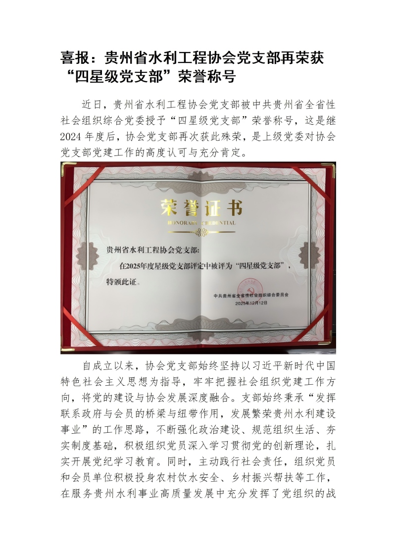 喜报:贵州省水利工程协会党支部再荣获“四星级党支部”荣誉称号